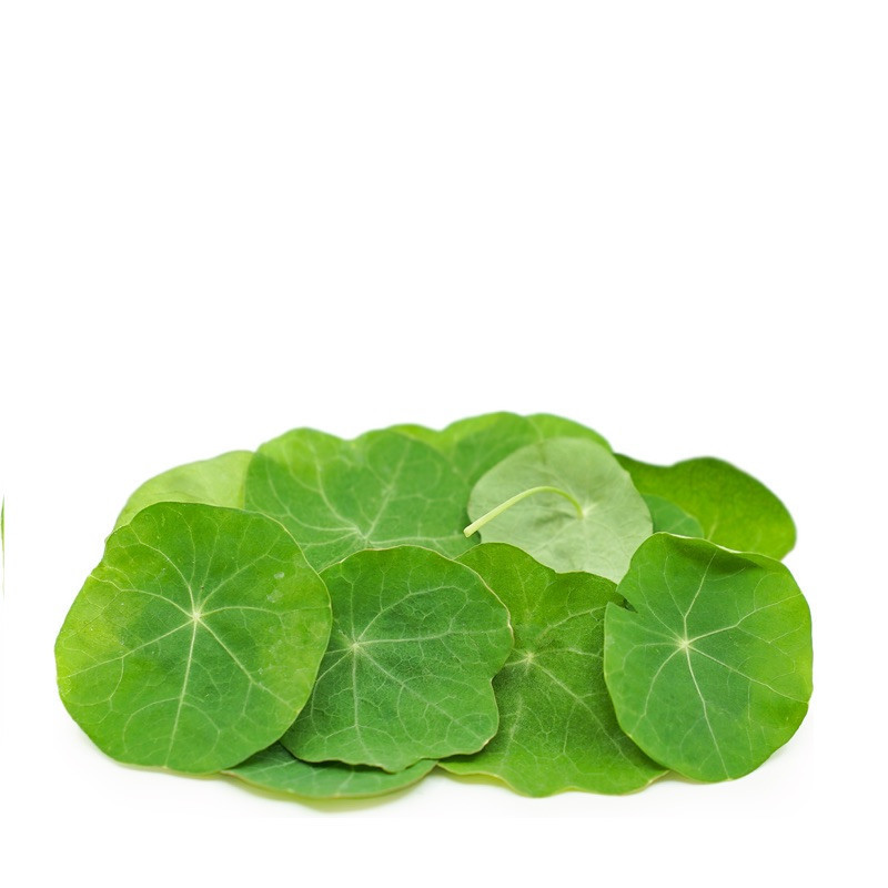 Nasturtium leaves come from the plant Tropaeolum majus, a species of annual plant in the Tropaeolaceae family. This plant is native to South America and is appreciated for both its ornamental beauty and its culinary and medicinal uses. Nasturtium leaves are characterized by their rounded shape and striking green hues, which can vary from intense green to lighter shades.