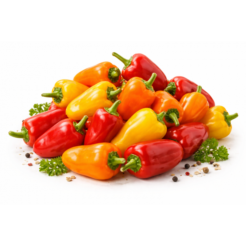 The baby tricolor pepper is a variety of pepper characterized by its small size and colorful appearance, with three different colors: red, yellow, and green. This pepper is highly valued for its mild and sweet flavor, as well as its versatility in the kitchen.
